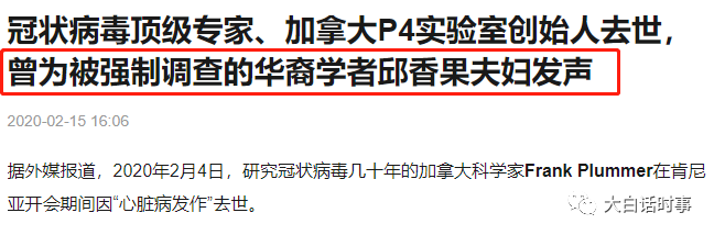 更离奇的是,跟邱香果夫妇关系甚好的这个加拿大P4实验室的创始人,在今年2月4日,离奇死亡。