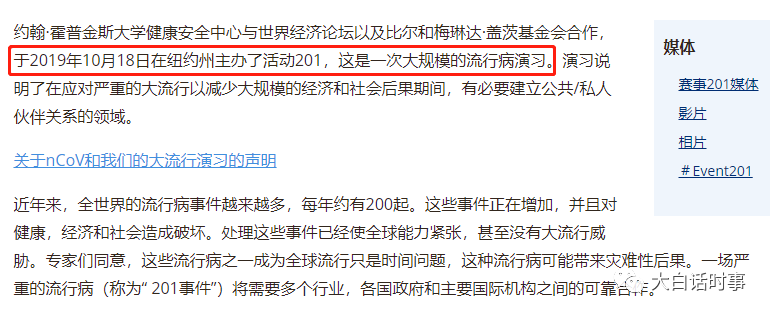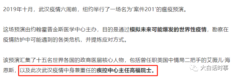 2019年10月18日,纽约举办了201事件进行大规模流行病的演习,美国中央情报局副局长参与了这场演习。